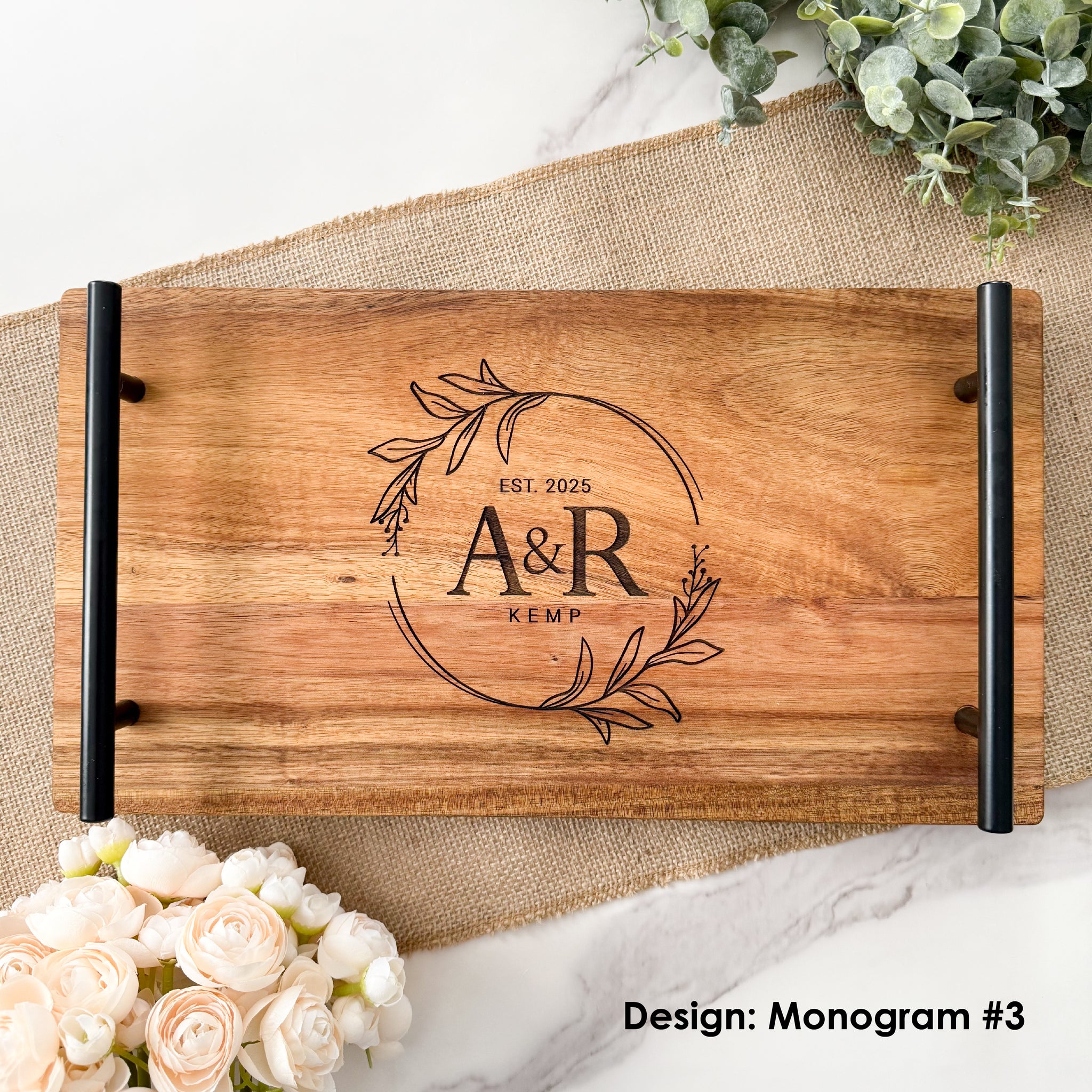 Personalized Acacia Serving Platter with Black Handles – Perfect Wedding & Engagement Gift