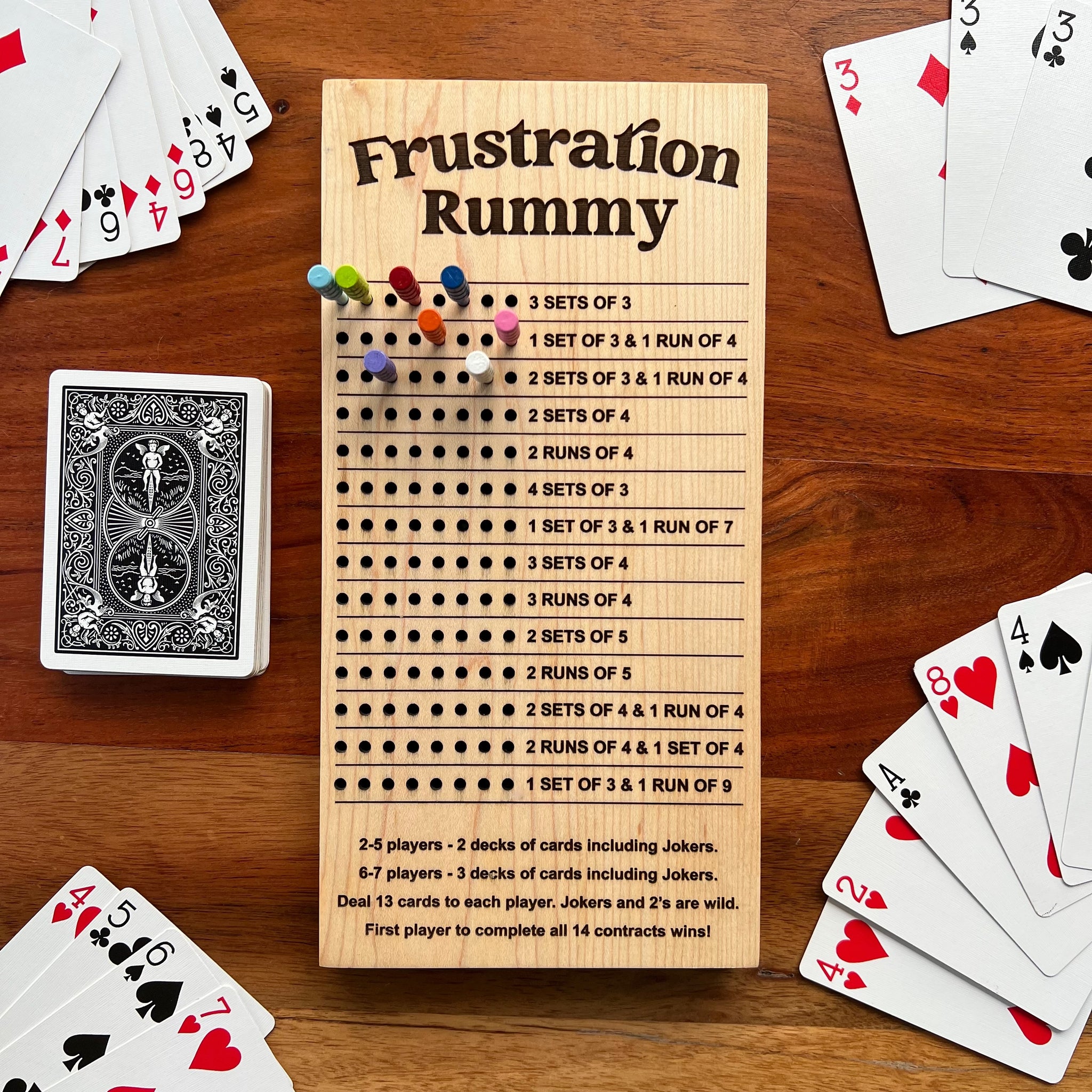 A Beck Street Woodworking family favorite! Our Frustration Rummy Scoreboard is perfect for game nights with the family. It features a 5x10" maple board game with 8 pegs and a built-in magnetic storage compartment. This popular card game is similar to Phase 10 and is great for camping trips or game nights at home.
